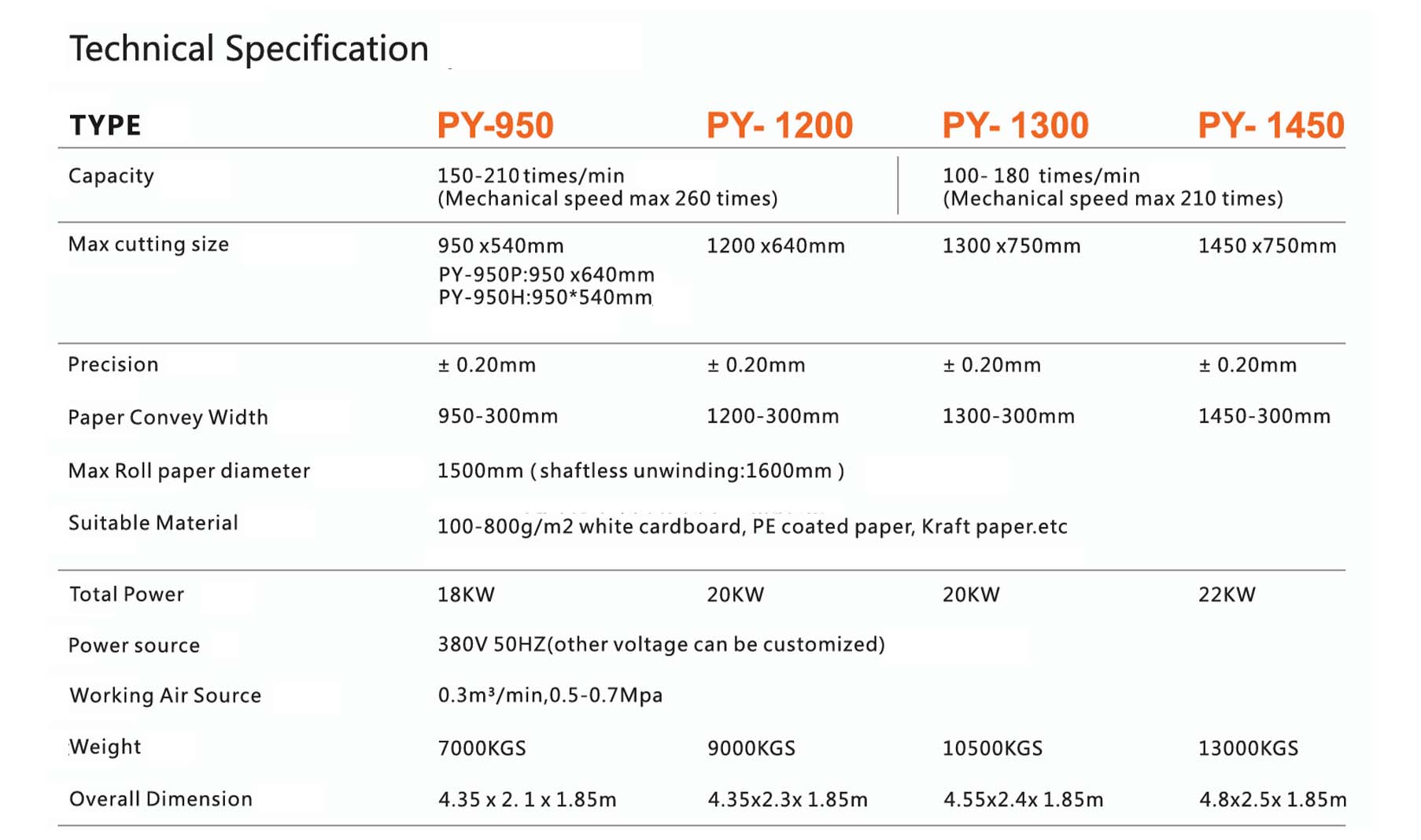 DAKIOU PY-950/1450 Bobin halinde gelen hammaddeyi kullanılan bıçağın ölçüsü doğrultusunda kesim makinesidir. Çeşitli sigara kutuları, ilaç kılıfı, zarflar, kağıt bardak, kağıt kase, hediye çantaları ve çeşitli kağıt ürünlerinin kırılması, kalıp kesmesi için uygundur.